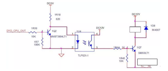 “DYD_CPU_OUT”連接LPC2367,輸出高低電平,高電平,1U4不通,1Q7不通,UCE=12V,1Q7-3=12V,線圈兩端電壓為0V。