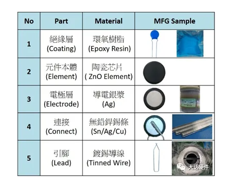 從上面的示意圖中可以看出,壓敏電阻主要有5個(gè)部件組成:絕緣層,本體,導(dǎo)電銀漿,連接條,引腳。