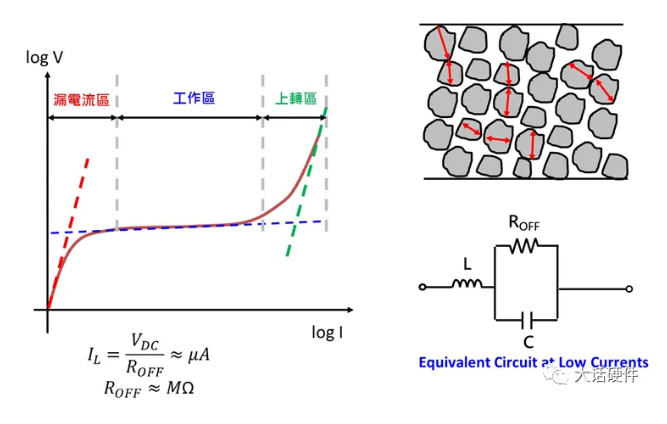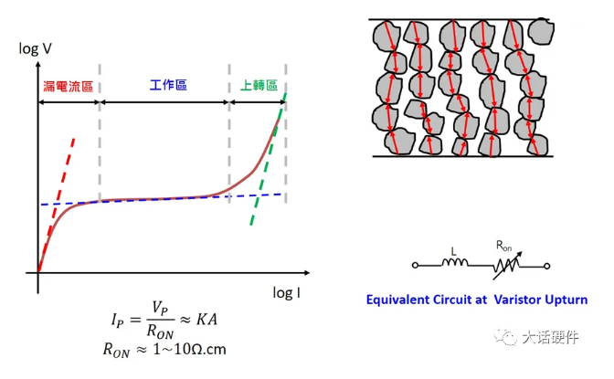 壓敏電阻的伏案特性具有非線性,根據(jù)電壓的不同,可以將壓敏電阻的伏案曲線分為三個(gè)部分,漏電流區(qū)(Leakage Region)」、「工作區(qū) (Normal Region)」及「上轉(zhuǎn)區(qū) (Upturn Region)」。
