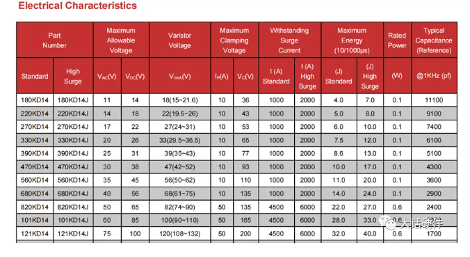 從上面兩個(gè)廠家的器件規(guī)格書可以提煉出壓敏電阻的關(guān)鍵參數(shù)有如下幾個(gè):