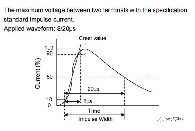 也就是壓敏電阻在發(fā)揮作用后,即使外界的電壓很高,但是最終都會(huì)被鉗位型的器件鉗位在某一個(gè)固定的電壓。壓敏電阻的最大鉗位電壓是指,在壓敏電阻兩端施加規(guī)定的8/20us波沖擊電流時(shí),壓敏電阻上呈現(xiàn)的電壓。施加的電流為某特定的脈沖電流波,在規(guī)格書中都有詳細(xì)的說(shuō)明。如下圖所示。
