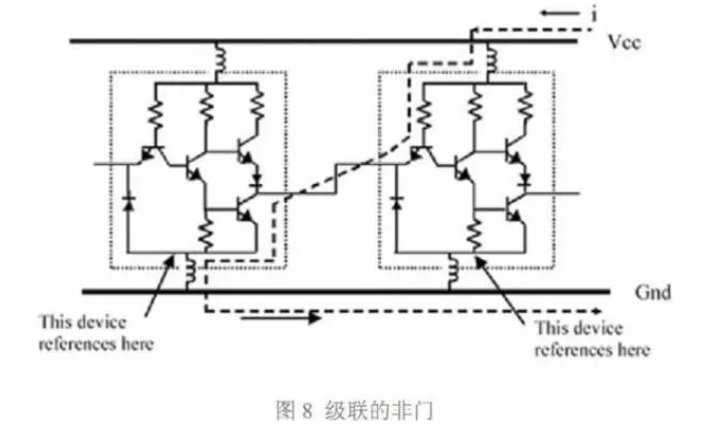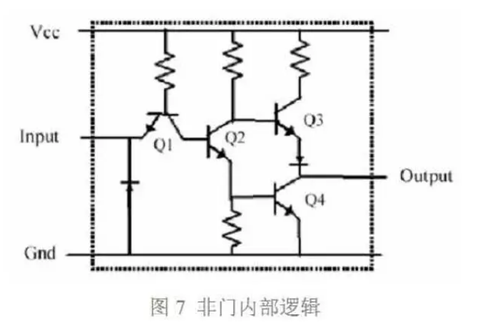 我們從一個典型邏輯電路入手,討論局部退耦設計方法。圖 7 是典型的非門(NOT GATE) 電路。當輸入(Input)低電平時,Q1 打開,拉低 Q2 的基極,因此 Q4 的基極被拉低, Q3 打開,輸出(Output)高電平。