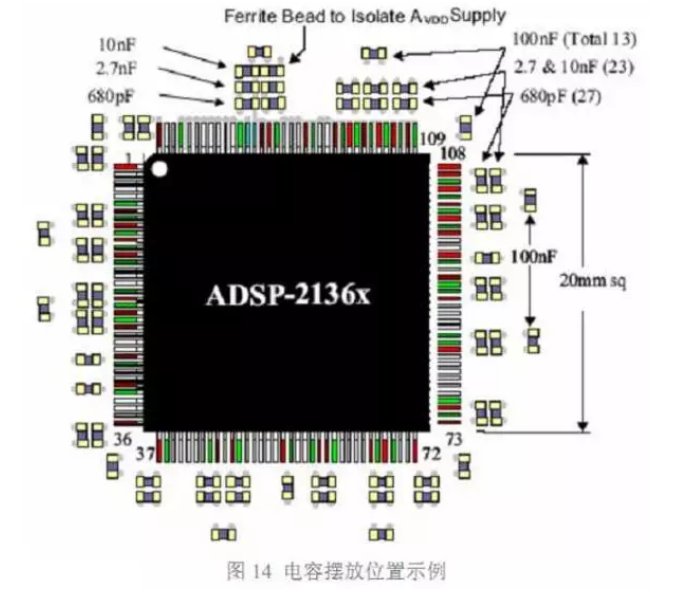 對于電容的安裝,首先要提到的就是安裝距離。容值最小的電容,有最高的諧振頻率, 去耦半徑最小,因此放在最靠近芯片的位置。容值稍大些的可以距離稍遠,最外層放置容值 最大的。但是,所有對該芯片去耦的電容都盡靠近芯片。下面的圖 14 就是一個擺放位置 的例子。本例中的電容等級大致遵循 10 倍等級關(guān)系。