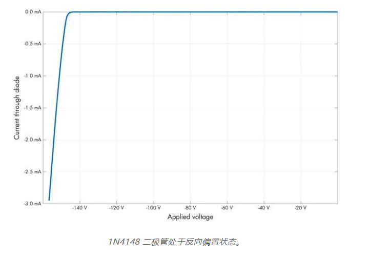 到目前為止,我們討論了稱為正向偏置的情況。如果二極管被反向偏置,即 p 側(cè)的電壓低于 n 側(cè),該元件理論上保持不導(dǎo)電。嗯……在一定程度上是這樣。