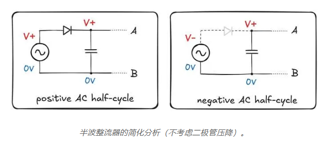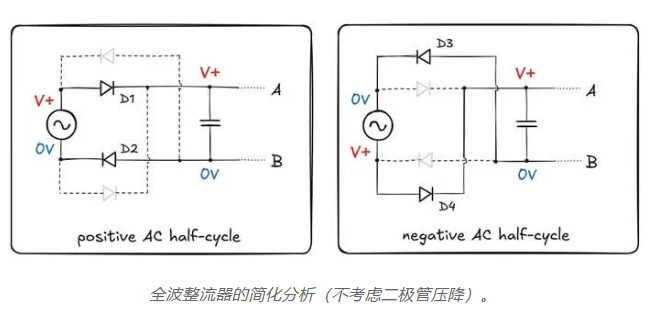 在正半周期,二極管 D1 和 D2 最初是正向偏置的;這允許電容器充電到交流峰值電壓(減去兩個(gè)二極管的壓降總和)。在負(fù)半周期,二極管 D3 和 D4 變?yōu)檎蚱?,這將輸出 B 連接到上部電源端子。同時(shí),當(dāng)前處于更高電壓的底部電源端子連接到 A 點(diǎn)。這允許電容器繼續(xù)以與之前相同的極性充電。