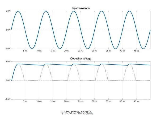 在正弦波的正半周期,當(dāng)電源的上部端子為正時(shí),二極管最初是正向偏置的。假設(shè)信號(hào)源阻抗較低,這允許電容器充電到等于輸入信號(hào)峰值幅度減去某個(gè)二極管壓降的電壓。