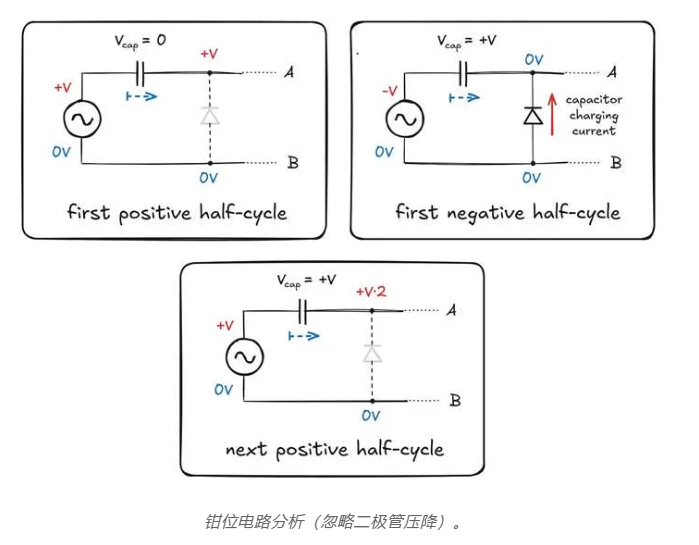 在接下來(lái)的正周期中,二極管再次變?yōu)榉聪蚱?,因此電容器必須保持其先前的電荷;這意味著 V(cap) 保持不變,并且 A 點(diǎn)的電壓必然從輸入波形偏移了該量。如果輸入波形在 -V(peak) 到 +V(peak) 之間運(yùn)行,則輸出現(xiàn)在將從大約 -600 mV 移動(dòng)到 V(peak)*2 – 600 mV。
