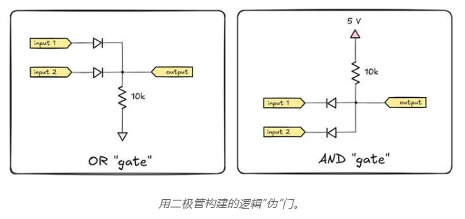 在或門電路(左)的情況下,如果正電源軌連接到任何輸入端子,這將使相應(yīng)的二極管正向偏置,并導(dǎo)致電流流過(guò)電阻。因?yàn)檎蚱枚O管的阻抗遠(yuǎn)低于 10 kΩ 電阻的阻抗,所以輸出電壓會(huì)飆升到非常接近上電源軌。