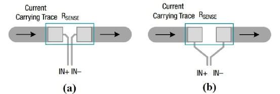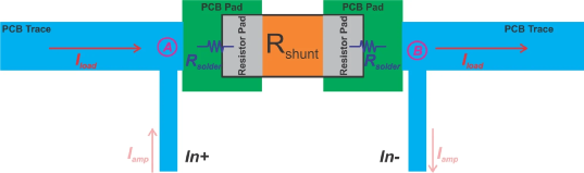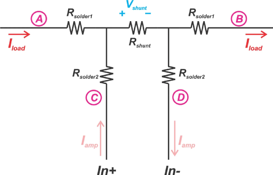 在該圖中,負(fù)載電流沿紅色箭頭方向從左向右流動(dòng)。垂直走線(xiàn)將分流電阻器連接到放大器輸入(In+和In-)。因此,放大器會(huì)檢測(cè)A點(diǎn)和B點(diǎn)之間的電壓差。檢測(cè)電阻的實(shí)際值將為Rshunt+2Rsolder。焊接電阻可以在幾百微歐的范圍內(nèi)。