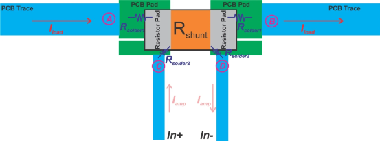 在這種情況下,有兩對(duì)PCB焊盤(pán):一對(duì)用于將Rshunt連接到負(fù)載,另一對(duì)用于將Rshunt連接到放大器輸入。在大電流應(yīng)用中,放大器消耗的電流(Iamp)遠(yuǎn)小于Iload。因此上述布局可以減少阻焊電阻造成的誤差。