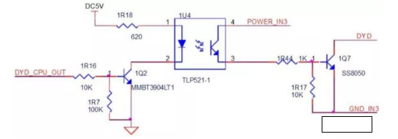 “DYD_CPU_OUT”連接LPC2367,輸出高低電平,高電平,1U4不通,1Q7不通,UCE=12V,1Q7-3=12V,線圈兩端電壓為0V。