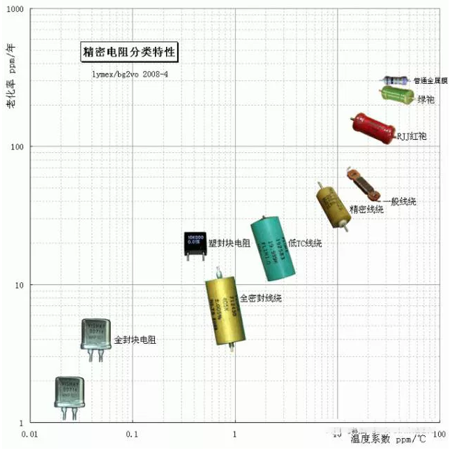 以下為精密電阻分類特性圖,基礎(chǔ)數(shù)據(jù)是基于自己多年的收集、積累、測試整理而成。橫軸為溫度系數(shù),縱軸為老化率,因此,任何一個電阻都可以在這圖有一個位置,越靠近左下角表明電阻越好。