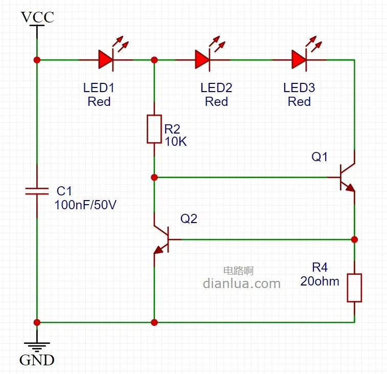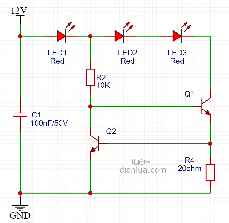 能實現(xiàn)恒流,是因為電阻R4被三極管Q2的基極發(fā)射極(be極)鉗位為0.7V,流過它的電流也就固定為: