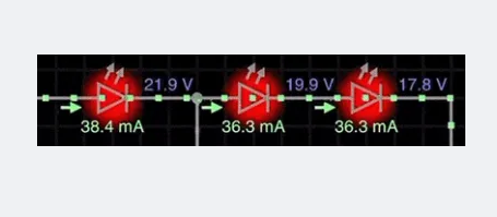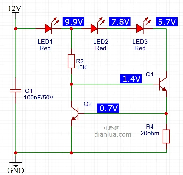 1、從12V出發(fā),每經(jīng)過1個LED電壓降低2.1V,可以確定以下3個電路節(jié)點的電壓分別為9.9V、7.8V、5.7V: