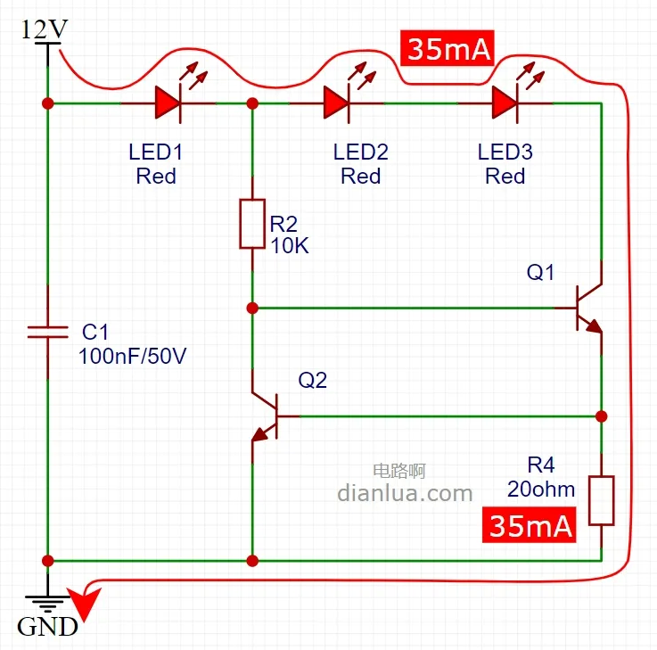 因為三極管的基極只流入很小的電流,所以可以忽略,于是這個35mA基本就是流過三極管Q1的電流,也基本就是流過LED燈的電流: