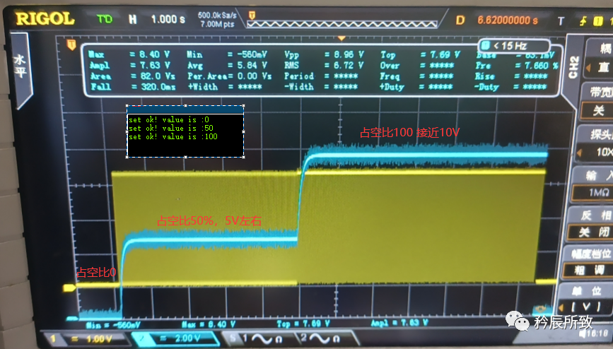 如果 PWM 的頻率比較低會怎樣,比如,我 PWM 周期為 1HZ,然后占空比設置為50% ,直接給大家看一個圖: