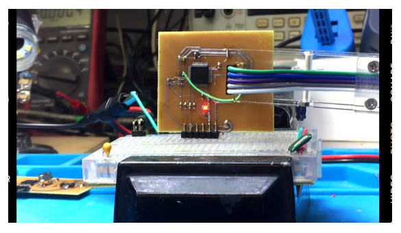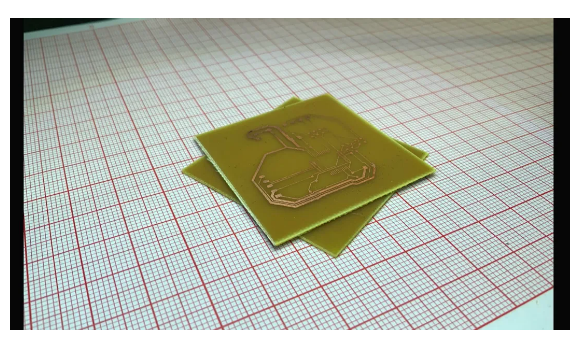 一分鐘之后獲得了兩塊測試PCB電路板,其中有一塊有點過腐蝕。使用另外一塊比較正常的進(jìn)行測試。