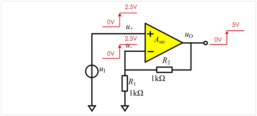 假設(shè)剛開始時(shí),各處電壓為0,突然u1瞬間從0變?yōu)?.5V,因?yàn)閡o一開始為0V,根據(jù)“虛斷”,u-沒有電流流入放大器,所以u(píng)-為uo在R1和R2上的分壓,依然為0V。