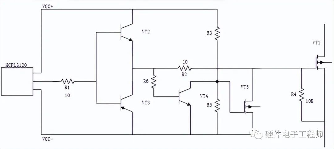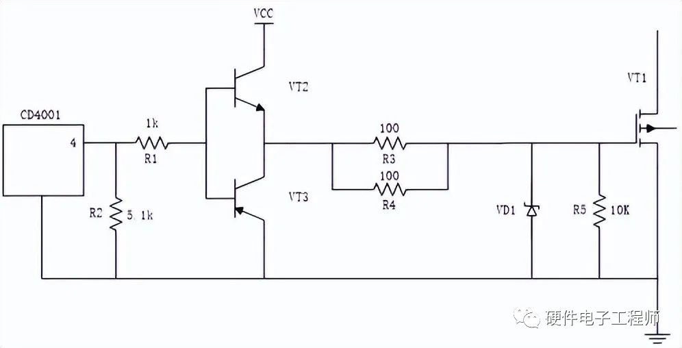圖3相比圖1和圖2,增加了VT2和VT3組成的圖騰柱電路,圖騰柱電路就是推挽輸出電路。圖騰柱就是上下各一個(gè)三極管,上管為NPN,c極(集電極)接正電源,下管為PNP,c極(集電極)接地。兩個(gè)b極(基極)接一起,接輸入,上管和下管的e極(發(fā)射極)接到一起,接輸出,像一個(gè)“圖騰柱”。用同一信號(hào)驅(qū)動(dòng)兩個(gè)b極。驅(qū)動(dòng)信號(hào)為高時(shí),NPN導(dǎo)通;信號(hào)為低時(shí),PNP導(dǎo)通。利用兩個(gè)晶體管構(gòu)成推挽輸出以增強(qiáng)驅(qū)動(dòng)能力。
