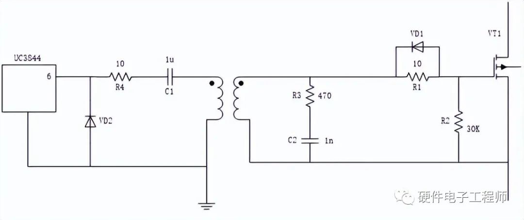 圖4是一個(gè)采用正激隔離變壓器實(shí)現(xiàn)電氣隔離的驅(qū)動(dòng)電路??刂菩酒捎昧薝C3844,其輸出為高電平時(shí),輸出電流經(jīng)過R4、C1給變壓器初級(jí)線圈勵(lì)磁。次級(jí)線圈為高電平輸出,通過驅(qū)動(dòng)電阻R1來驅(qū)動(dòng)MOS管導(dǎo)通。