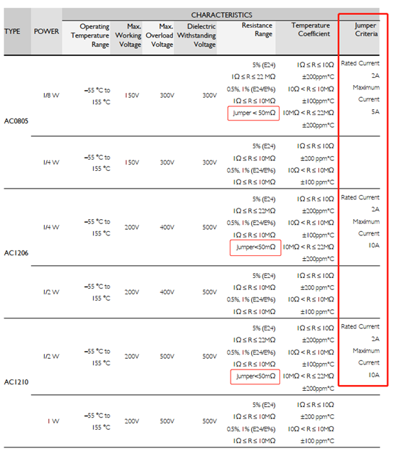 網(wǎng)上還有一種觀點(diǎn),認(rèn)為0Ω電阻的電流是根據(jù)功率算出來的,電阻按照50mΩ來算。這樣的話,0805的電阻功率一般為1/8W,算出額定電流應(yīng)該是1.58A。但是,我查看規(guī)格書發(fā)現(xiàn),羅姆、國巨、光頡這幾大品牌的都是2A,與計(jì)算出來的有些出入。