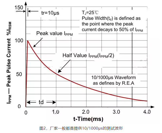 TVS 要通過測試,故實際電路中要求 10/1000μs 波形下 TVS 的最小功率 P actual 為:-------其中di/dt為波形轉(zhuǎn)換系數(shù),如實際測試波形為其他波形,如 8/20μs波形,建議di/dt取,如測試波形為 10/1000μs,取,實際選型中,TVS 應(yīng)留有一定的裕量,TVS 的功率PPMP 選擇應(yīng)遵循Pppm>Pactual。