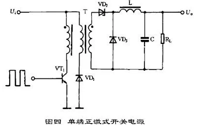 單端正激式開(kāi)關(guān)電源的典型電路如圖四所示。這種電路在形式上與單端反激式電路相似,但工作情形不同。當(dāng)開(kāi)關(guān)管VT1導(dǎo)通時(shí),VD2也