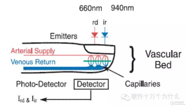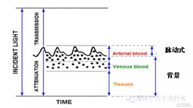 當(dāng)你有脈動(dòng)的時(shí)候,走過(guò)毛細(xì)血管的時(shí)候把氧分子丟下了,回到這邊是還原的血紅蛋白。所以檢測(cè)的時(shí)候,紅光和紅外光都是一個(gè)光,一方面會(huì)受到組織結(jié)構(gòu)的衰減,再有受到靜脈血的衰減,還有動(dòng)脈的衰減,動(dòng)脈有兩個(gè)部分,一部分是存量的,總是在里面的,由于心臟的博動(dòng),有一部分脈動(dòng)的血紅蛋白,血紅蛋白會(huì)增加。