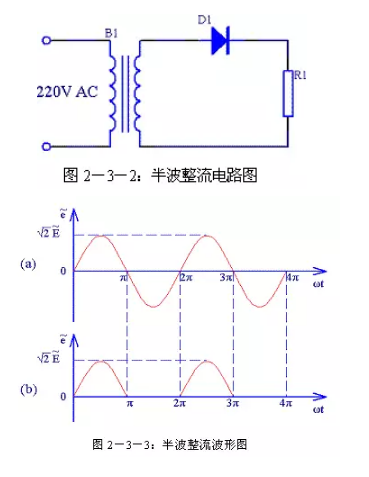 (1)半波整流電路半波整流電路見圖2-3-2。其中B1是電源變壓器,D1是整流二極管,R1是負(fù)載。B1次級是一個方向和大小隨時間變化的正弦波電壓,波形如圖 2-3-3(a)所示。0~π期間是這個電壓的正半周,這時B1次級上端為正下端為負(fù),二極管D1正向?qū)?,電源電壓加到?fù)載R1上,負(fù)載R1中有電流通過;π~2π期間是這個電壓的負(fù)半周,這時B1次級上端為負(fù)下端為正,二極管D1反向截止,沒有電壓加到負(fù)載R1上,負(fù)載R1中沒有電流通過。在 2π~3π、3π~4π等后續(xù)周期中重復(fù)上述過程,這樣電源負(fù)半周的波形被“削”掉,得到一個單一方向的電壓,波形如圖2-3-3(b)所示。由于這樣得到的電壓波形大小還是隨時間變化,我們稱其為脈動直流。
