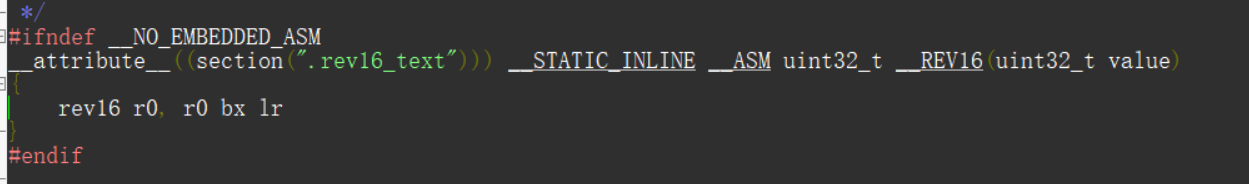 STM32的庫(kù)部分存在匯編語(yǔ)言,格式化后可能會(huì)導(dǎo)致編譯錯(cuò)誤。例如對(duì)cmsis_armcc.h進(jìn)行格式化時(shí) 會(huì)導(dǎo)致匯編語(yǔ)句錯(cuò)誤。