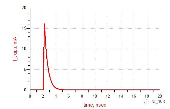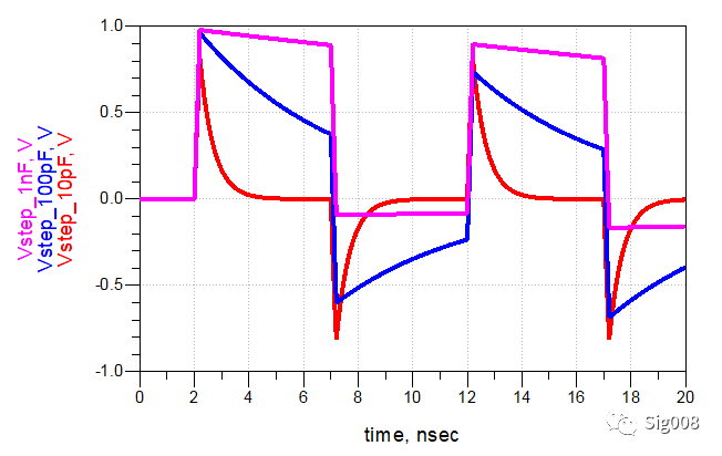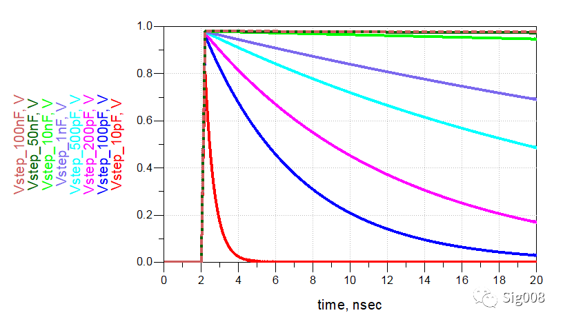 從公式中可以看出,通過電容的電流迅速升高,然后按照上述公式,程倒指數(shù)下降,而下降的速度和指數(shù)的冪有關(guān),冪越大,下降的越快,而當(dāng)冪當(dāng)中的τ,也就是RC的值越小時(shí),電容電流下降的越快,相反,當(dāng)RC,也就是電容的值越大時(shí),電容電流下降的越慢,如上圖,當(dāng)電容達(dá)到50nF時(shí),幾乎能保持相當(dāng)?shù)臅r(shí)間了,足夠滿足100Mhz以上的信號了。
