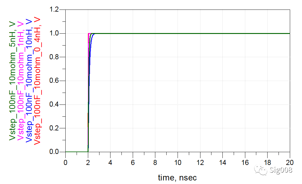 當(dāng)前上身邊沿為30ps,可見幾乎也沒有影響,下面來對比一下不同電感值的波形: