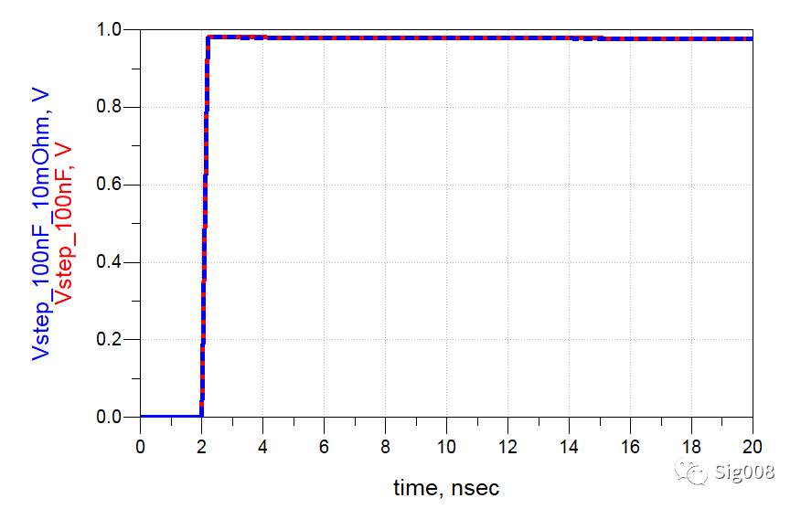 下面看一下在100nF的電容后面緊跟著一個(gè)10 mOhm的電阻,波形如下: