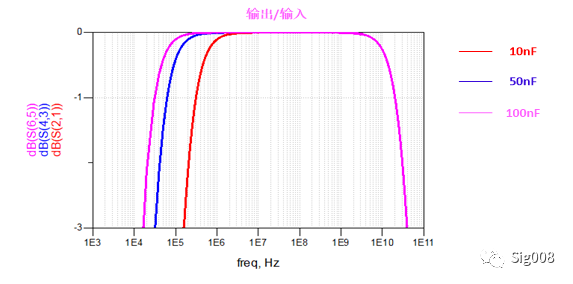 由仿真波形,可以直觀的得出結(jié)論,電容容值越大,信號越可以順利通過;