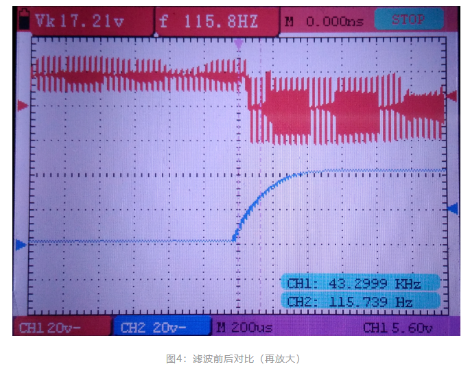 ?圖2、圖3、圖4是實(shí)測(cè)無(wú)刷電機(jī)霍爾信號(hào)濾波前后的波形對(duì)比,紅色波形代表霍爾信號(hào)濾波前的;藍(lán)色波形代表霍爾信號(hào)濾波后的。濾波前的毛刺異常恐怖。