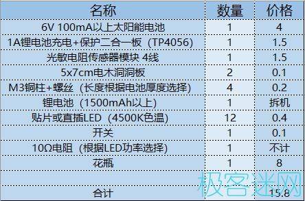 下面是所需要的材料,整個制作下來只需要不到20元,大量采用現(xiàn)成可以直接買到的模塊以降低難度,并且部分材料(比如電池、花瓶)可以廢物利用。