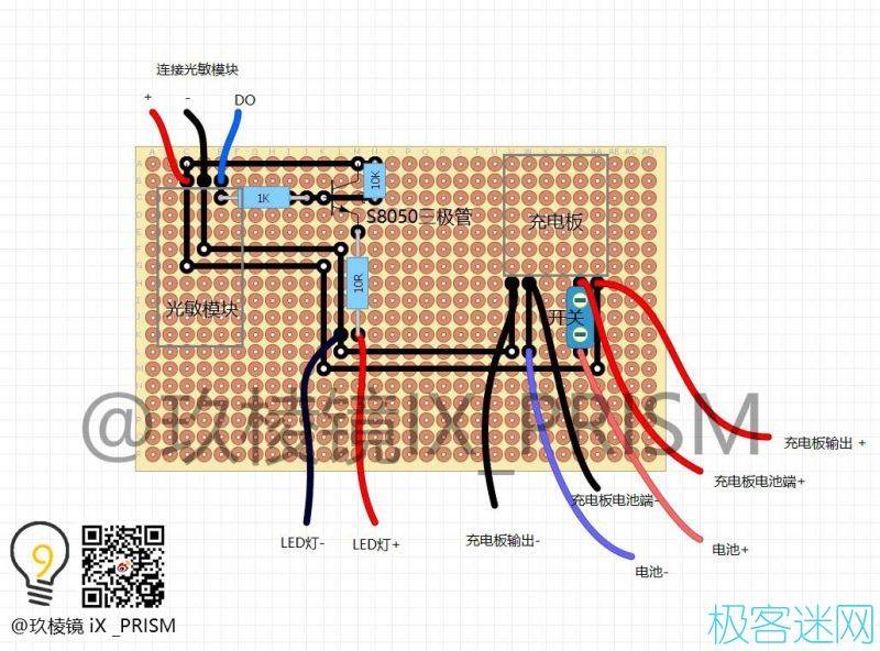 1.用電烙鐵將LED牢牢地焊在第一塊洞洞板上(并聯(lián)),這個過程比較復雜,如果嫌麻煩的話可以在購物網(wǎng)站上找一些現(xiàn)成的燈板,甚至可以找?guī)в泻懔黩寗拥腖ED板,這種情況下只使用三個現(xiàn)成的模塊(充電、光敏、LED)就能完成整個制作。