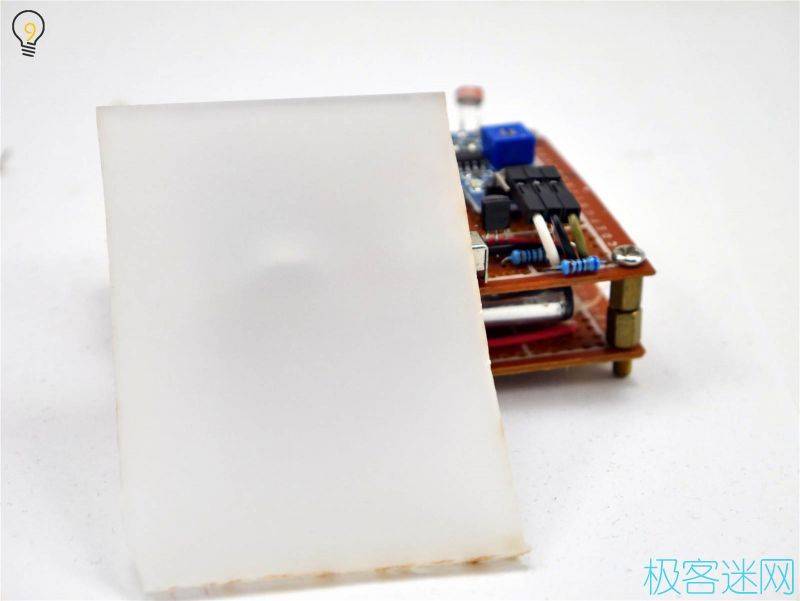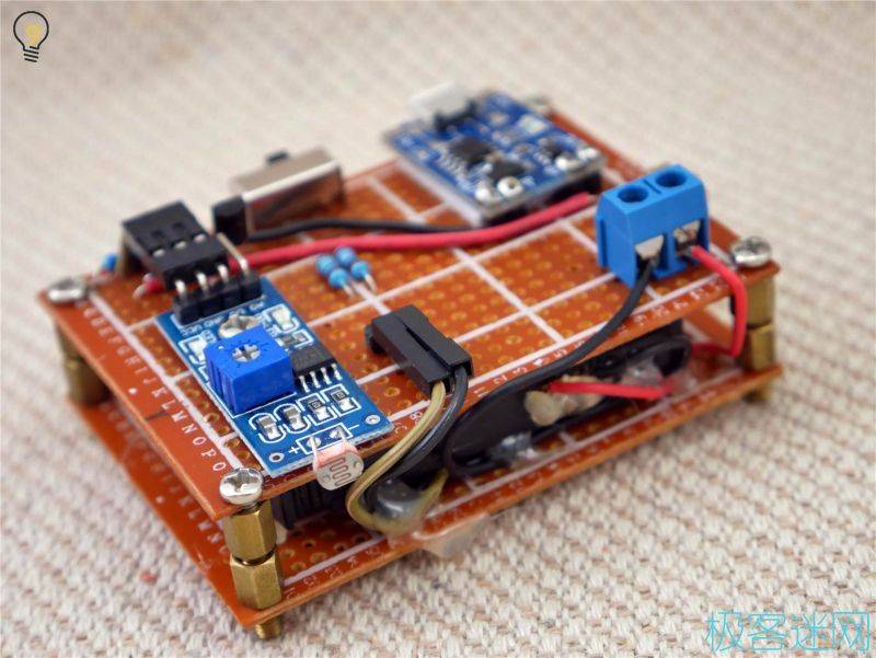 7.最后將上下兩部分組合,主體就完成的差不多了,已經(jīng)能開機進行測試,記得在此時將光敏模塊的靈敏度調整至合適,可以在拉上窗簾的室內使用臺燈進行測試。