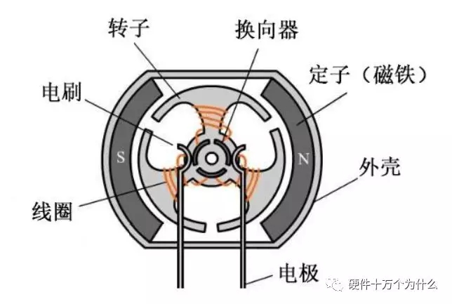 有刷電機(jī)是大家最早接觸的一類電機(jī),中學(xué)時(shí)物理課堂上介紹電動(dòng)機(jī)也是以它為模型來(lái)展示的。有刷電機(jī)的主要結(jié)構(gòu)就是定子+轉(zhuǎn)子+電刷,通過(guò)旋轉(zhuǎn)磁場(chǎng)獲得轉(zhuǎn)動(dòng)力矩,從而輸出動(dòng)能。電刷與換向器不斷接觸摩擦,在轉(zhuǎn)動(dòng)中起到導(dǎo)電和換相作用。