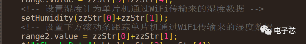 接下來對濕度數(shù)據(jù)進(jìn)行提取,之前的溫度計(jì)中已經(jīng)接收到數(shù)據(jù),所以非常方便。在js代碼中獲取到前端的控件,包括濕度計(jì)高度和數(shù)據(jù)顯示。如下端代碼的range2和humidity。