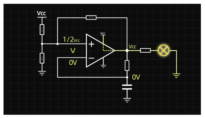 首先電容直接接地還沒開始充電,所以這個(gè)點(diǎn)就是0V,也就是反向輸入端是0V,此時(shí)同相輸入端電壓是1/2Vcc,比反向輸入大,所以輸出的是電源電壓,此時(shí)燈泡亮起。