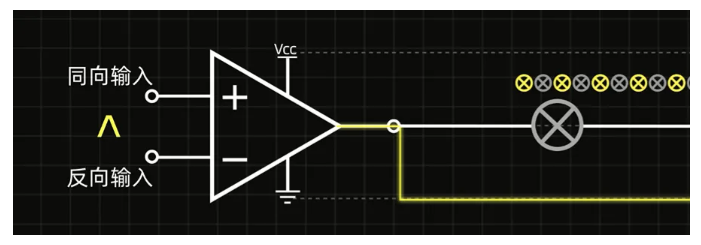 發(fā)明運(yùn)算放大器的人絕對(duì)是天才。中間兩端接上電源,當(dāng)同相輸入大于反相輸入,右側(cè)就會(huì)輸出(接近)電源電壓(Vcc),如果反過來小于同相輸入,則輸出0V(負(fù)電源)電壓。