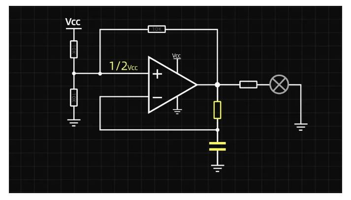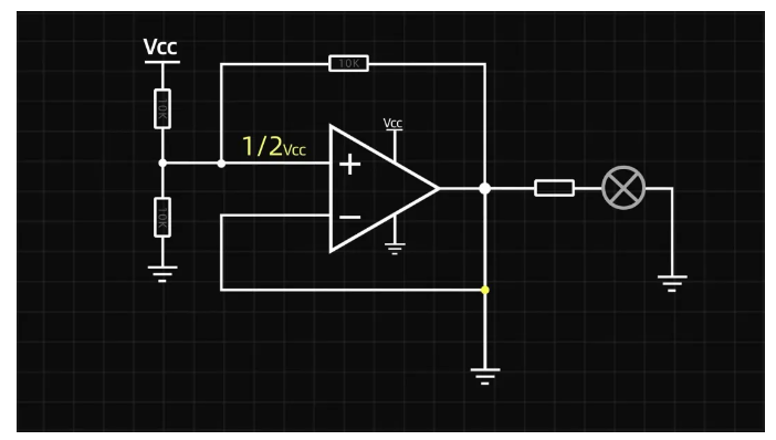 將電源通過兩個(gè)相同阻值的電阻進(jìn)行串聯(lián)分壓,可以得到這個(gè)點(diǎn)就是電源的1/2電壓,然后直接和同相輸入端相連。