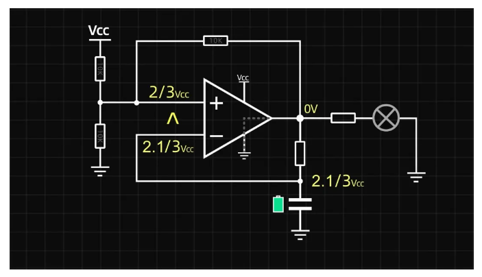 繼續(xù)看這里,這個(gè)時(shí)候也會(huì)同時(shí)給電容充電,也就是這個(gè)點(diǎn)的電壓正在逐漸上升。一旦開始超過2/3Vcc,也就是此時(shí)反相比同相大,運(yùn)放則變成輸出接地0V,這個(gè)時(shí)候燈泡熄滅。