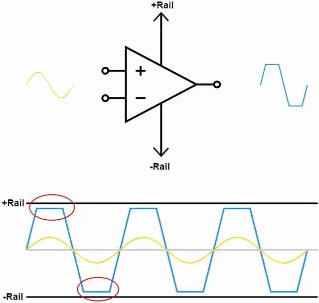 圖中 +Rail 表示正軌或正電源電壓;-Rail 表示負軌或負電源電壓。黃色波形是輸入波形,藍色波形是輸出波形。