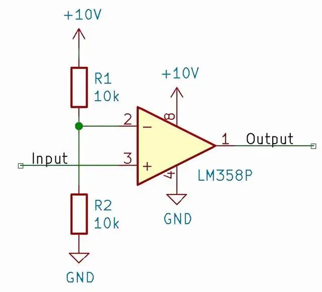 兩個10k 電阻構成分壓器接到反相輸入引腳,提供一個比較參考電壓 5 伏。正弦信號輸入到同相引腳。同相輸入引腳我們輸入一個以 5 伏為中心的正弦波,這會在輸出引腳輸出一個方波。