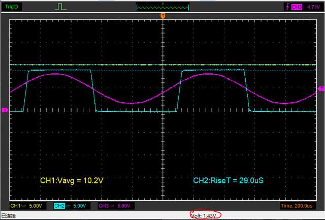 可以看到輸出波形的峰值達不到正電源電壓,我們用示波器光標測量功能測量其和正電源電壓的差距是 1.43 伏,接近數據手冊中的 1.5 伏: