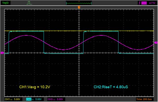 紫色波形是接到同相輸入的正弦波,青色是輸出波形,黃色是正電源電壓。