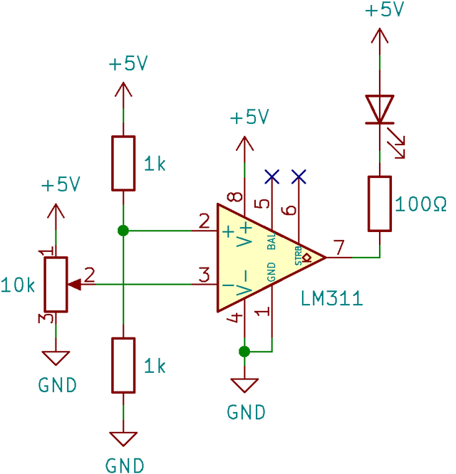 兩個 10k 的電阻構成的分壓器為同相引腳提供 2.5 伏的比較參考電壓??烧{電阻接到反相引腳,其可調電壓范圍為 0~5 伏: