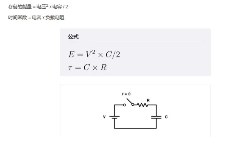 時(shí)間常數(shù) (T) 可由電容 (C) 和負(fù)載電阻 (R) 的值確定。電容器 (E) 中存儲(chǔ)的能量 (E) 由兩個(gè)輸入確定,即由電壓 (V) 和電容決定。